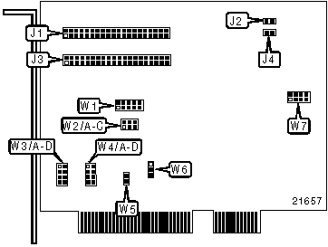 Older motherboards that do not have the capability to route IRQ24 and IRQ15 to the PCI slots, require you to use the separate paddle card to transfer those signals to the PCI bus. The paddle card is inserted in an ISA slot and connected to W1 on the controller board with a 10-pin cable. |