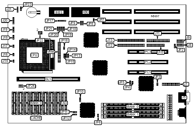 Note: Board accepts EDO memory. Board also accepts x 32 SIMMs. If using x 32 SIMMs, one module may be installed in the first socket on Bank 0 labeled SIMM 1. | ||