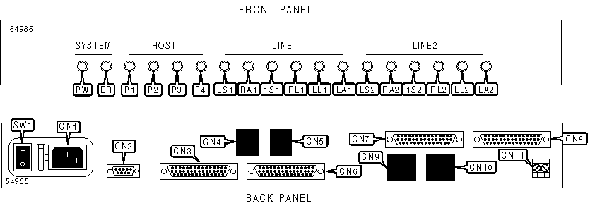 AC power connector, power switch, serial port, T1 network interface via RJ-48 connector (2), Alarm relay terminal block, palmtop port via RJ-12 connector (2), data port via 44-pin connector (4) |