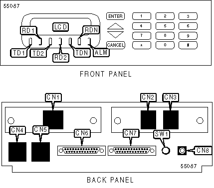 Note: The DBU interface module (CN1) may support a switched 56K interface via RJ-48 connector (shown), V.34 interface via RJ-11 connector, or ISDN interface via RJ-11 connector. The voice interface module (CN2, CN3) is available with Dual FXS, Dual FXO or Dual E&M signaling voice support. | |||