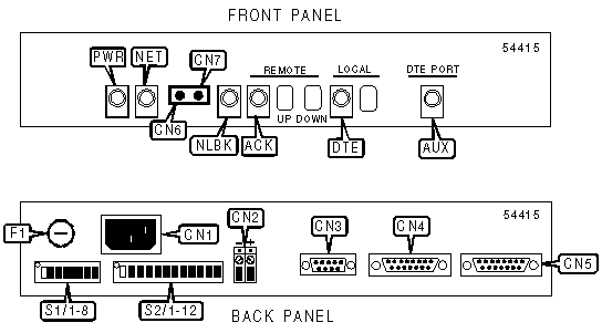 AC power connector, DC power connector, DTE port via 15-pin connector, serial port (RS-232), network interface via 15-pin connector monitor jack - transmit, monitor jack - receive |
