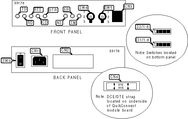 QuikConnectä serial interface module can be configured as a V.24/RS-232, V.35, RS422/530, or X.21 port. The DTE/DCE strap (X.21 only) is default configured for DCE interface. To change the interface to DTE, rotate the strap 180 degrees so the DTE arrows point to the X.21 port. | ||||||